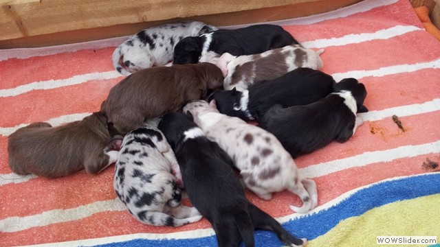 Die Welpen von Merle und Tiesto sind da :) 10 kleine Aussies in allen Farben. 2 blue merle Rueden, 1 red merle Ruede, 1 red merle Huendin, 2 red tri Rueden, 1 black tri Ruede und 3 black tri Huendinnen |